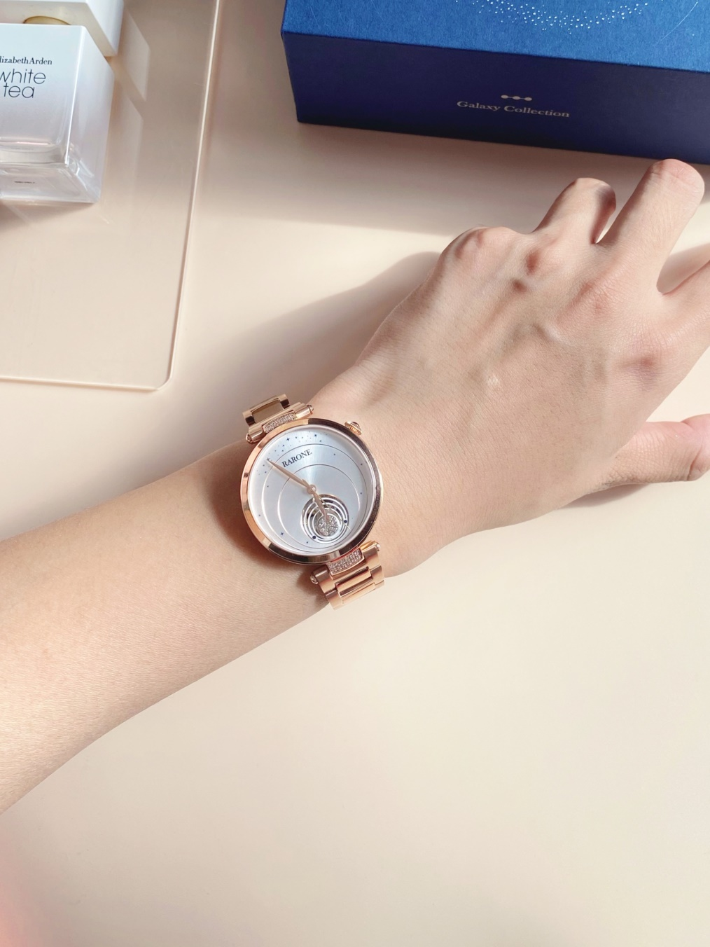 而且這款女士手表的有一個很浪漫的系列名“銀河”,聯想到漫漫星河,繁星點點,一聽名字就有很有愛的感覺。這款表有白色和藍色面兩款顏色,自己入手了白面的,然后閨蜜生日給閨蜜送了一只,她也很喜歡,出行游玩閨蜜裝搭閨蜜表,回頭率滿滿。