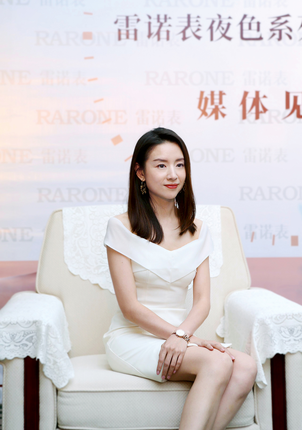 優(yōu)雅女神董潔一身梨白小禮服驚喜現(xiàn)身雷諾表專柜,一同品鑒雷諾新品腕表。